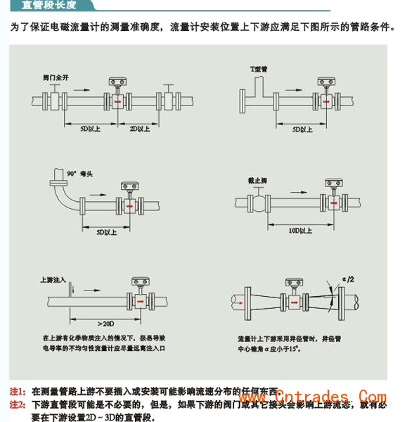 量表安装要求: 为了你正确的测量,在选择管道上位置时应注意以下几点要求: ⑴传感器既可在直管道上安装,也可以在水平或倾斜管道上安装,但要求二电的中心连线处于水平状态。 ⑵介质在安装位置应该满管流动,避免比满管及气体附着在电上。 ⑶对于液固两相流体,采用垂直安装,使被传感器衬里磨损均匀,延长使用寿命。 ⑷流量计安装位置介质不满管时,可采取抬高流量半后端管路的方法,使其满管,严禁在管道z高点和出水口安装流量计。 |