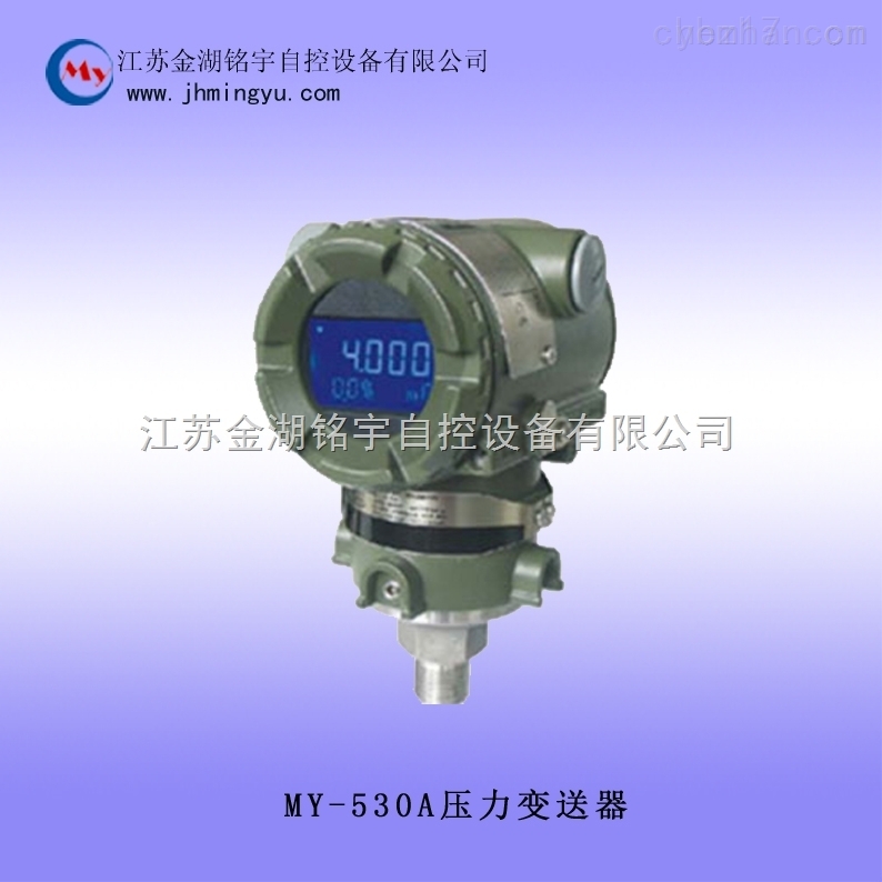 530A压力变送器详细资料: 530A压力变送器金湖铭宇自控设备有限公司 : MY-,EJA带HART协议,扩散硅智能压力变送器用于测量液体、气体或蒸汽的压力,并将其转换为4~20mA DC的电流信号输出。MY与EJA一样,也可与HART®275手操器互通讯,通过它们进行设定和监控等。 MY功能 输出:2线制,4~20mA DC输出,数字通讯,可编程设定线性或平方根输出方式,HART协议加载在4~20mA DC信号上。 电源电压:工作状态:10.5~42V DC 本 安 型:10.5~30V DC 数字通讯:16.4~42V DC 本 安 型:16.4~30V DC 负载:(输出信号代码为D和E时):工作状态:0~1335Ω 数字通讯:250~600Ω HART通讯距离:用多芯双绞线时可通讯距离z大达2Km。通讯距离因电缆类型而异。 环境温度:-40~85℃(-40~185?F) -30~80℃(-22~176?F)【带LCD表头】 接液温度:-40~120℃(-40~248?F)调量程的参考精度:(包括从零点开始的线性、滞后性和重复性):±0.075%稳定性:±0.1%量程上限/12个月 MY-530A带HART协议,扩散硅智能压力变送器型号和规格代码表 | 型号 | 规格代码 | 说 明 | 参考价 | 备注 | | SC530A | | 压力变送器 | | | | 输送信号 | E D | 4~20mA,HART协议数字通讯 4~20mA | | | 测量量程 (膜盒) | A B C D | 10~200Kpa(0.1~2kgf/cm2) 0.1~2Mpa (1~20kgf/cm2) 0.5~10Mpa(5~100kgf/cm2) 5~50Mpa (50~500kgf/cm2) | | | | 接液部分材质 | | 过程接头 | 膜盒 | | | | S | SUS316L | 哈氏合金C-276 | | | H | 哈氏合金C-276 | 哈氏合金C-276 | | | 管道连接 | 4 7 8 9 | ½NPT内螺纹 ½NPT外螺纹 G½DIN 16 288外螺纹 M20×1.5 DIN 16 288外螺纹 | | | | 电气接口 | 5 | G½内螺,2处接线口带盲塞 | | | | 显示表头 | D E N | 数字表头 带设定按钮的数字表头 (无表头) | | | | 2inch管安装支架 | A | SECC 平托架 | | | | B | SUC304 平托架 | | C | SECC L型托架 | | D | SUS304 L型托架 | | N | 无安装支架 | | 防爆方式 | d | 隔爆型BT4 | | | i | 本安型CT6 | | | 附加选型代码 | | /附加规格 |